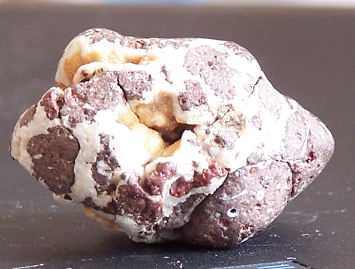 Elle est faite de roche brune d'origine sans doute volcanique avec des petits cristaux rouges inclus (très altérés) cimentée par un mineral blanc recouvert de petits cristaux jaunes (vraiment mini) que l'on peut qualifier de "en mamelons.