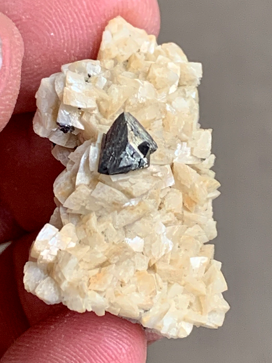 Bournonite, groupe de cristaux 'en tablettes rectangulaires biselées' naturellement 'corrodées' sur la Dolomite ; Calcite [cristal 35mm]
