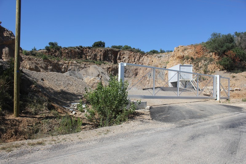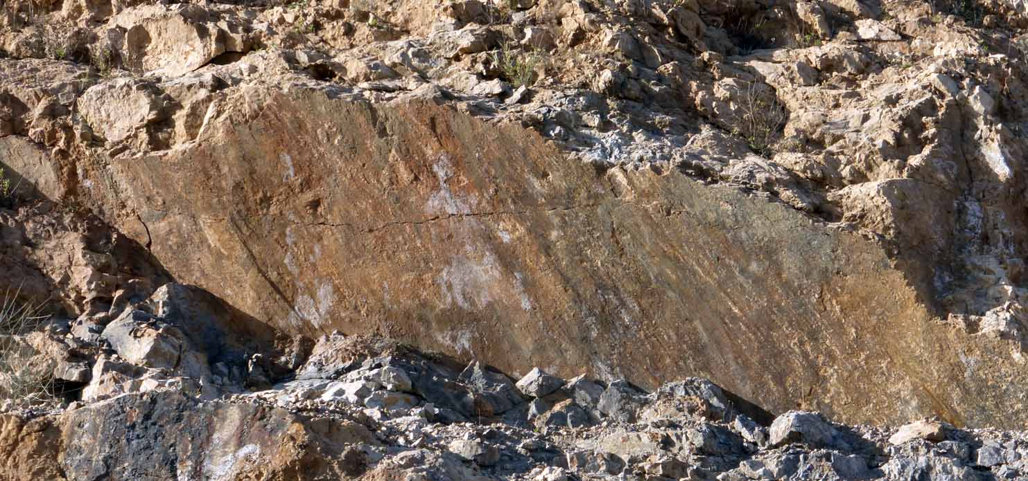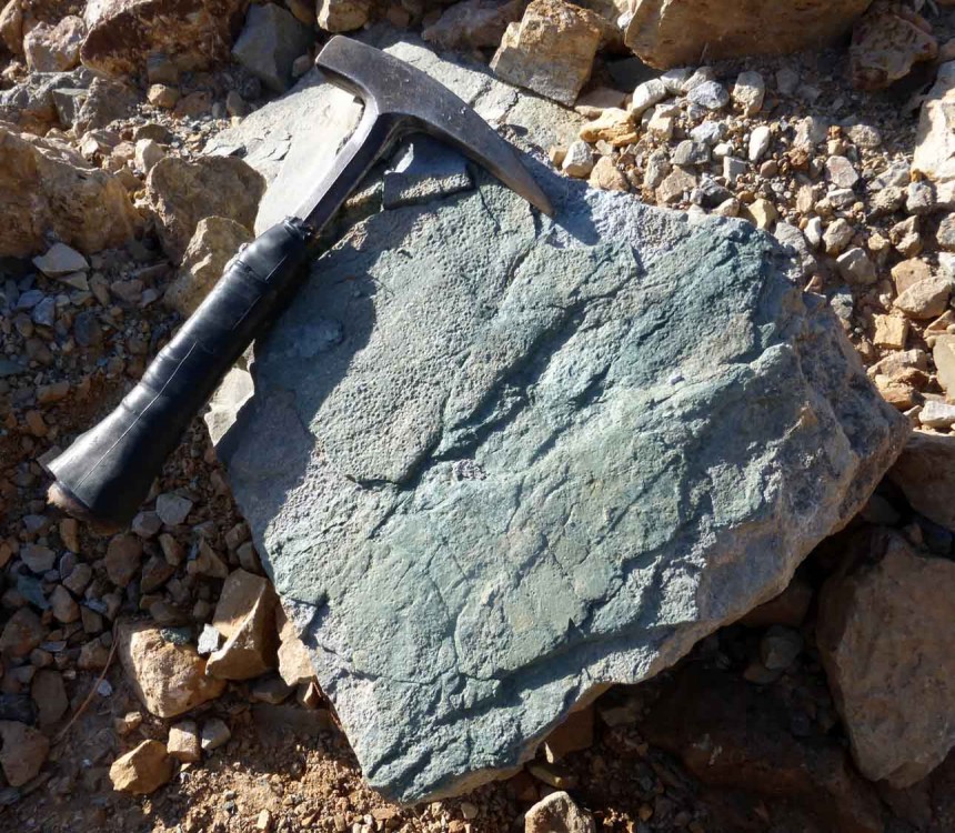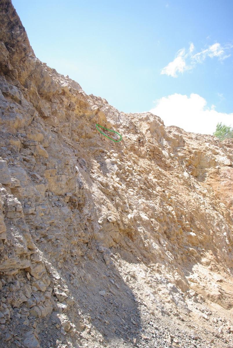 Front de taille avec entourés en vert les restes de la géode de baryte explosé par les dernier tire de mine, inaccessible, situé à 4m de haut au moins.