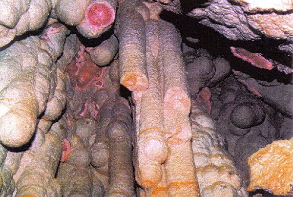 cette fois ce sera de la rhodocrosite en stalagtite (Argentine) ... la section rose en haut de l'image mesure 50 cm, je vous laisse imaginer la longueur des tubes!!!