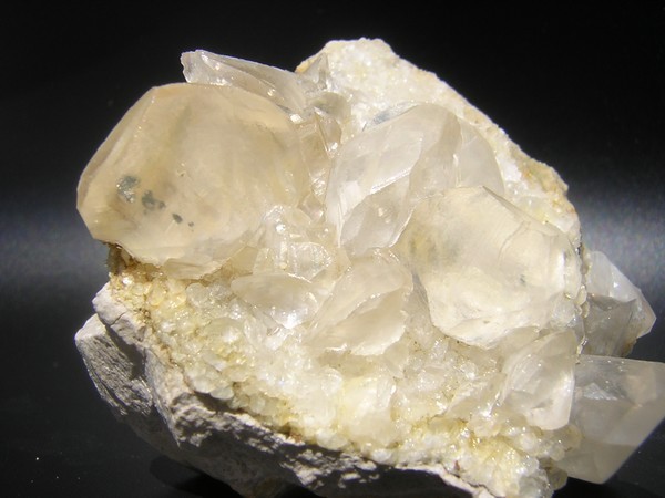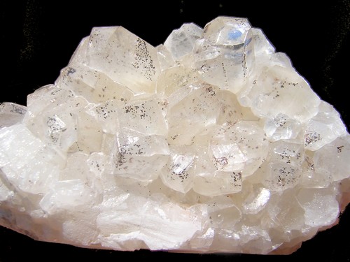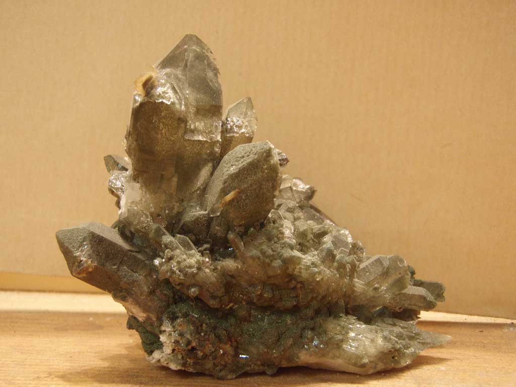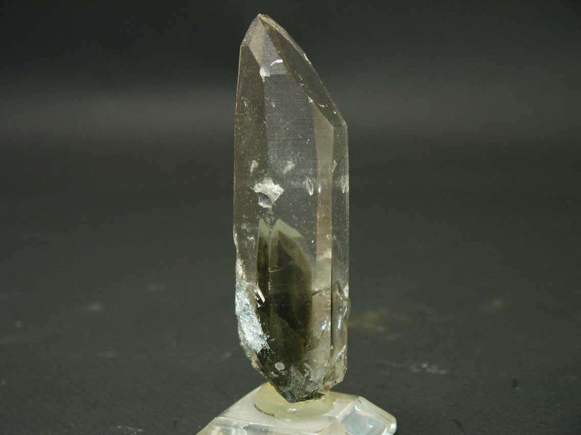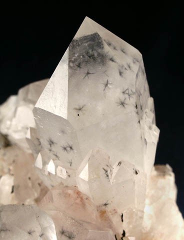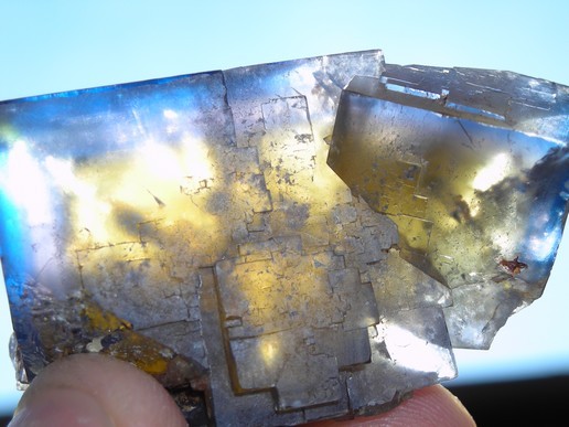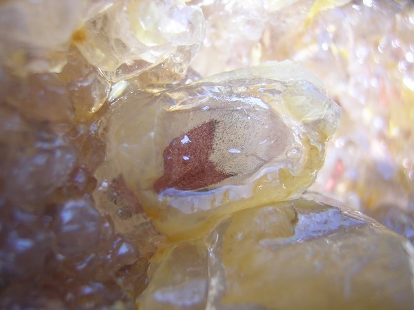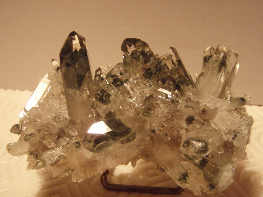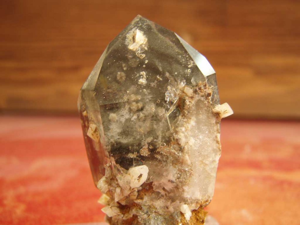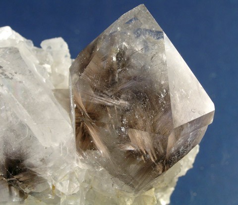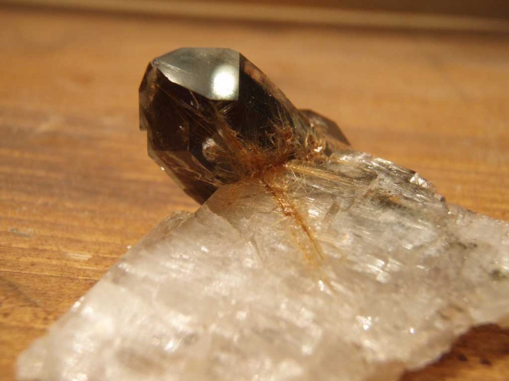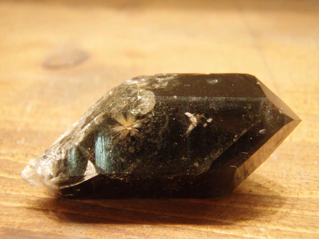 Dans le genre bizarre : inclusion de galène (??? Cristaux plus ou moins cubiques, gris/bleu brillants) dans un cristal de quartz !