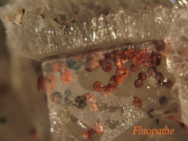 Fluorine de provenance inconnue, avec sur un plan cristallographique un saupoudrage de petits cristaux de pyrite (supposée) et dans une autre zone du cristal des inclusions en forme de goutte contenant un liquide fluorescent sous UV + une bulle mobile.