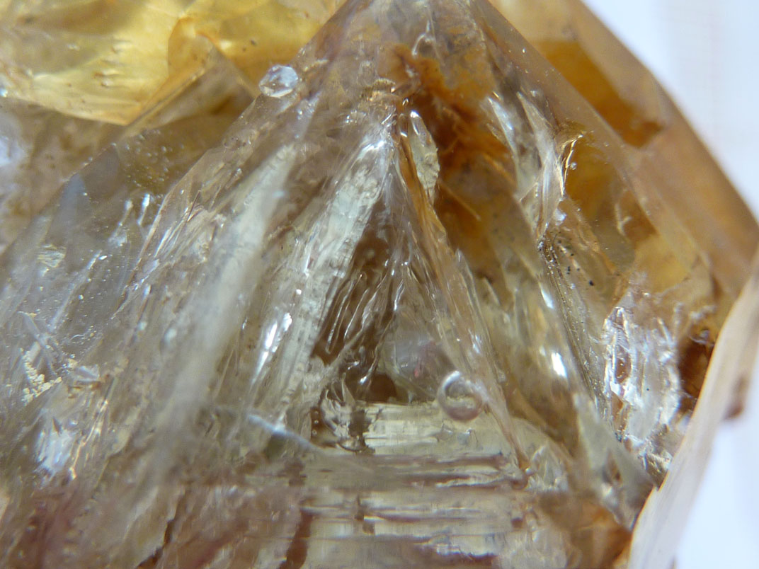 Sinon, je ne suis pas totalement sur qu'il y a bien presence d'eau liquide: en effet l'un des cristaux negatifs est a moitié rempli par une grosse goutte d'huile jaune, l'autre partie du cristal (qui au microscope apparait bien comme un volume) est incolore.