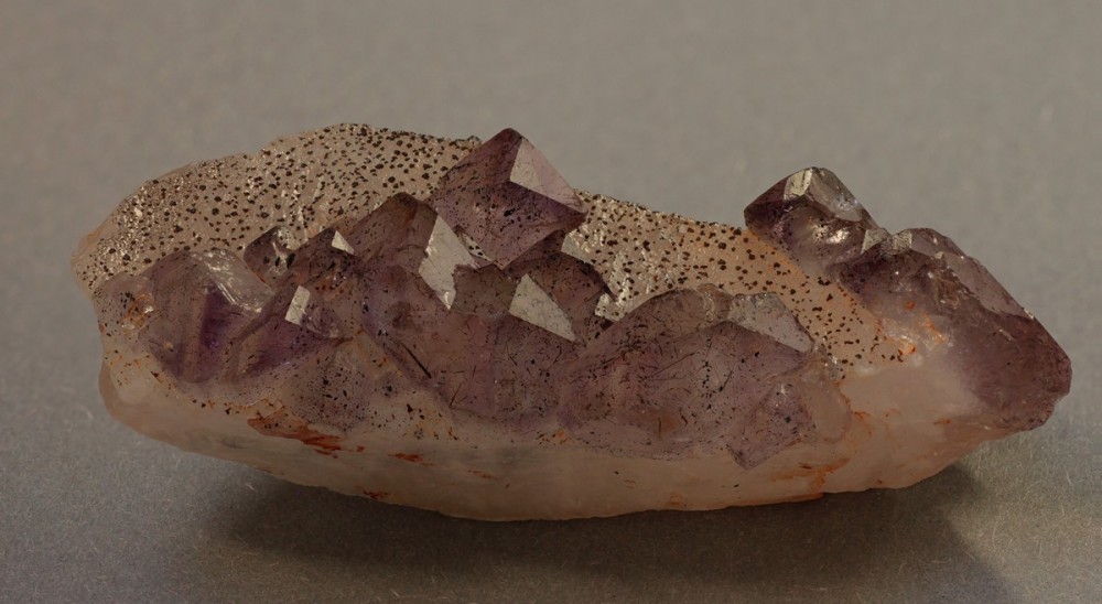 A la base, c'est un cristal de quartz assez informe de 7 cm sur lequel ont germé plusieurs cristaux à tendance améthyste.