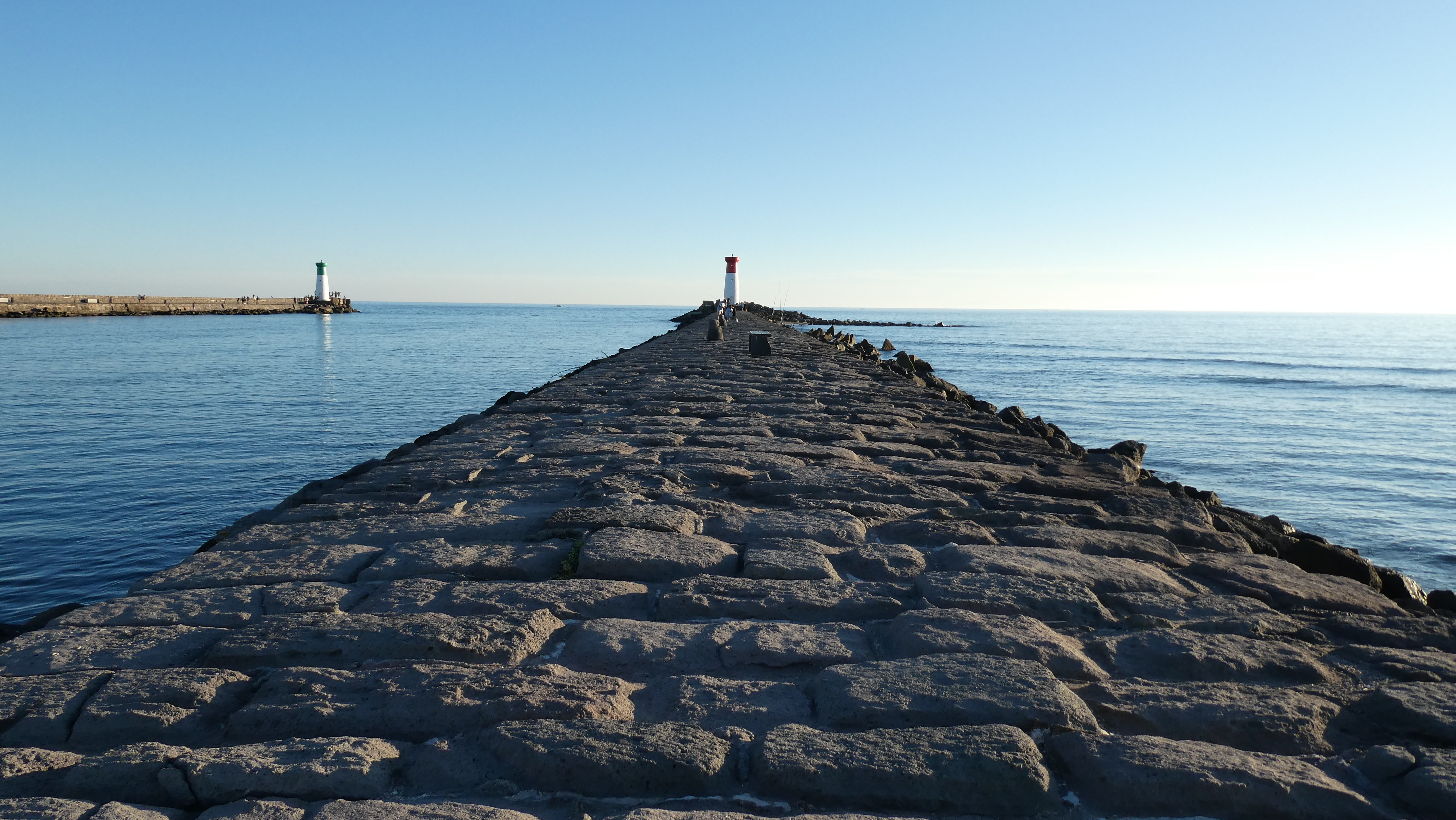 - photo 1: autour de la baie, alterance d'arkose claire de Limagne et de trachy-andésite sombre type pierre de Volvic. Sur la droite: brèches basaltiques rouges