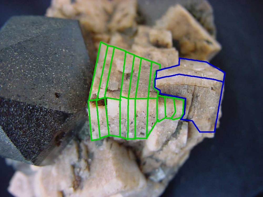 En fait, je pense qu'il y a deux types de macles. Une série de macles polysynthétiques (en vert) bien connues des pétrographes car elle donne l'aspect zébré typique au microscope et une macle par interpénétration de deux individus polysynthétiques (en bleu).