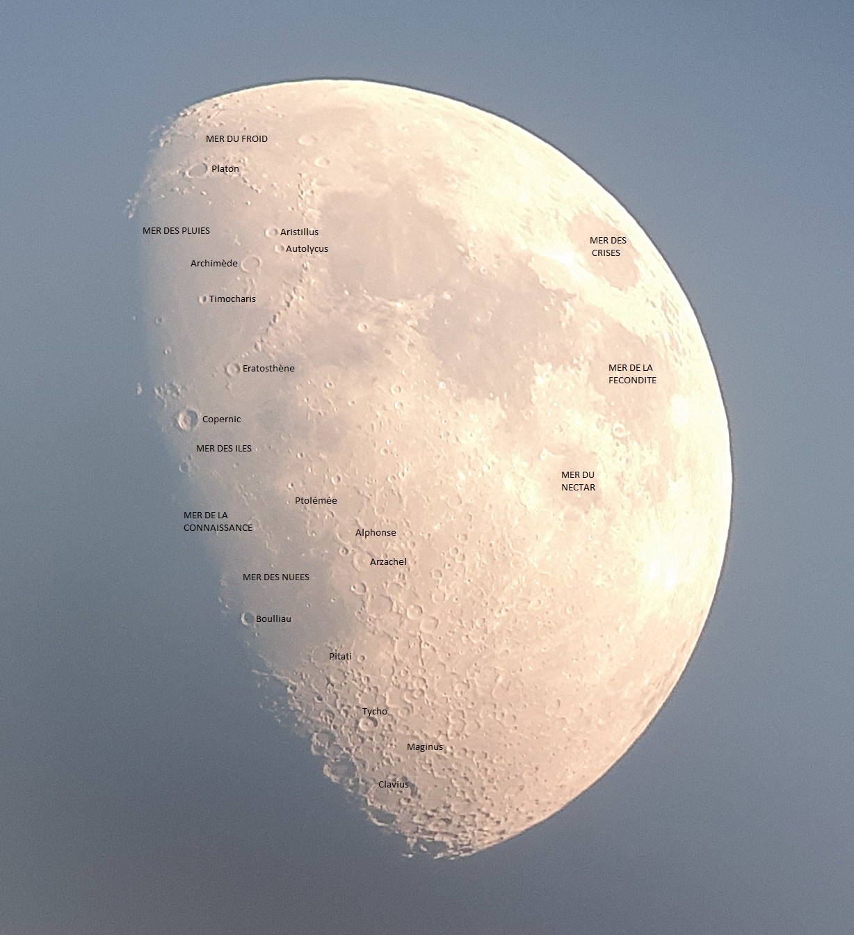 J'ai aussi fait le choix de mettre quelques noms en repère, ça peut être sympa pour celles et ceux qui observent la Lune et qui souhaitent s'orienter et connaitre quelques cratères et mers...