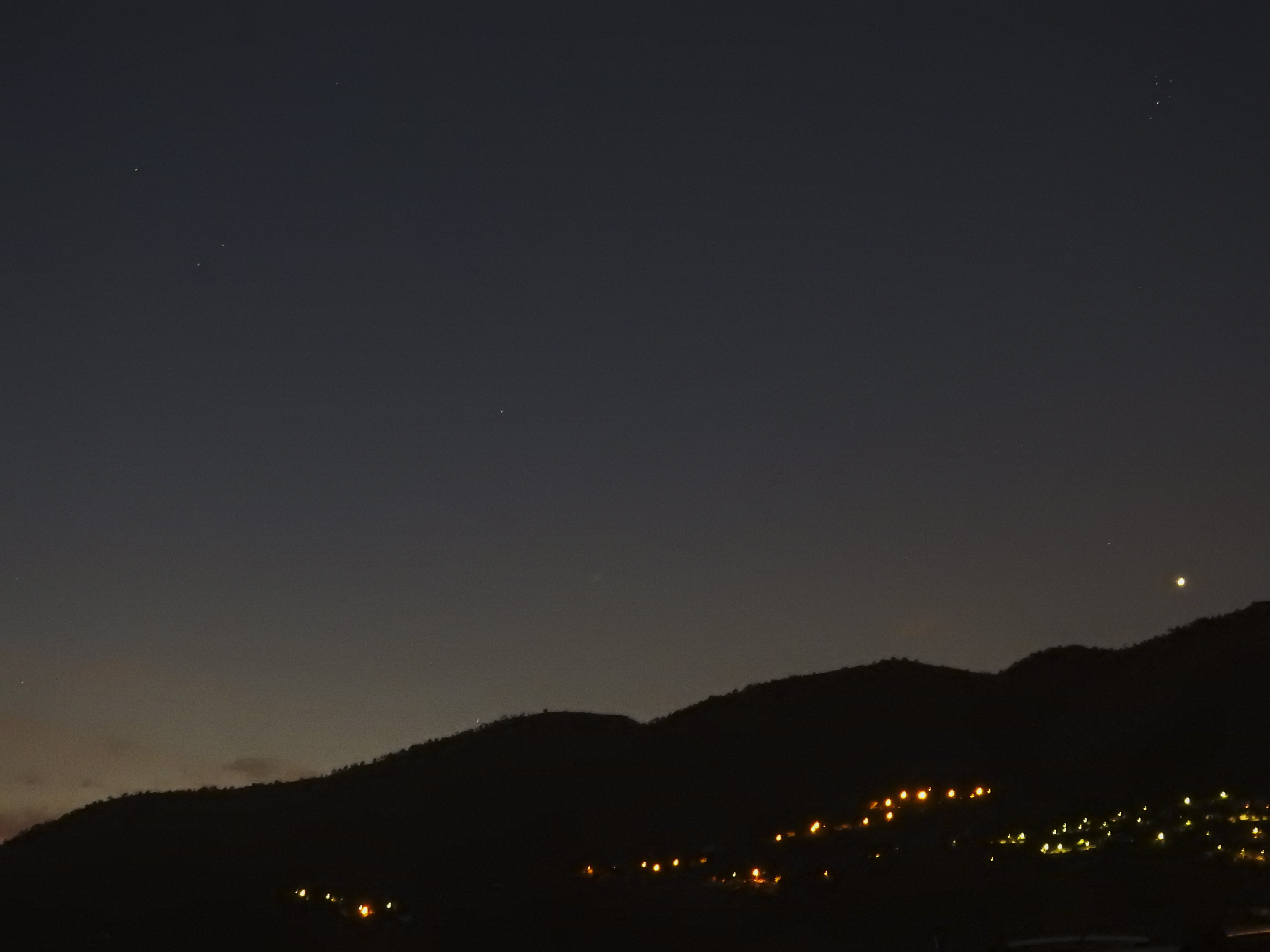 Même heure à quelques minutes près. J'ai de la chance, une terrasse sans vis-à-vis. Seul problème, les lumières de la ville dans le lointain.