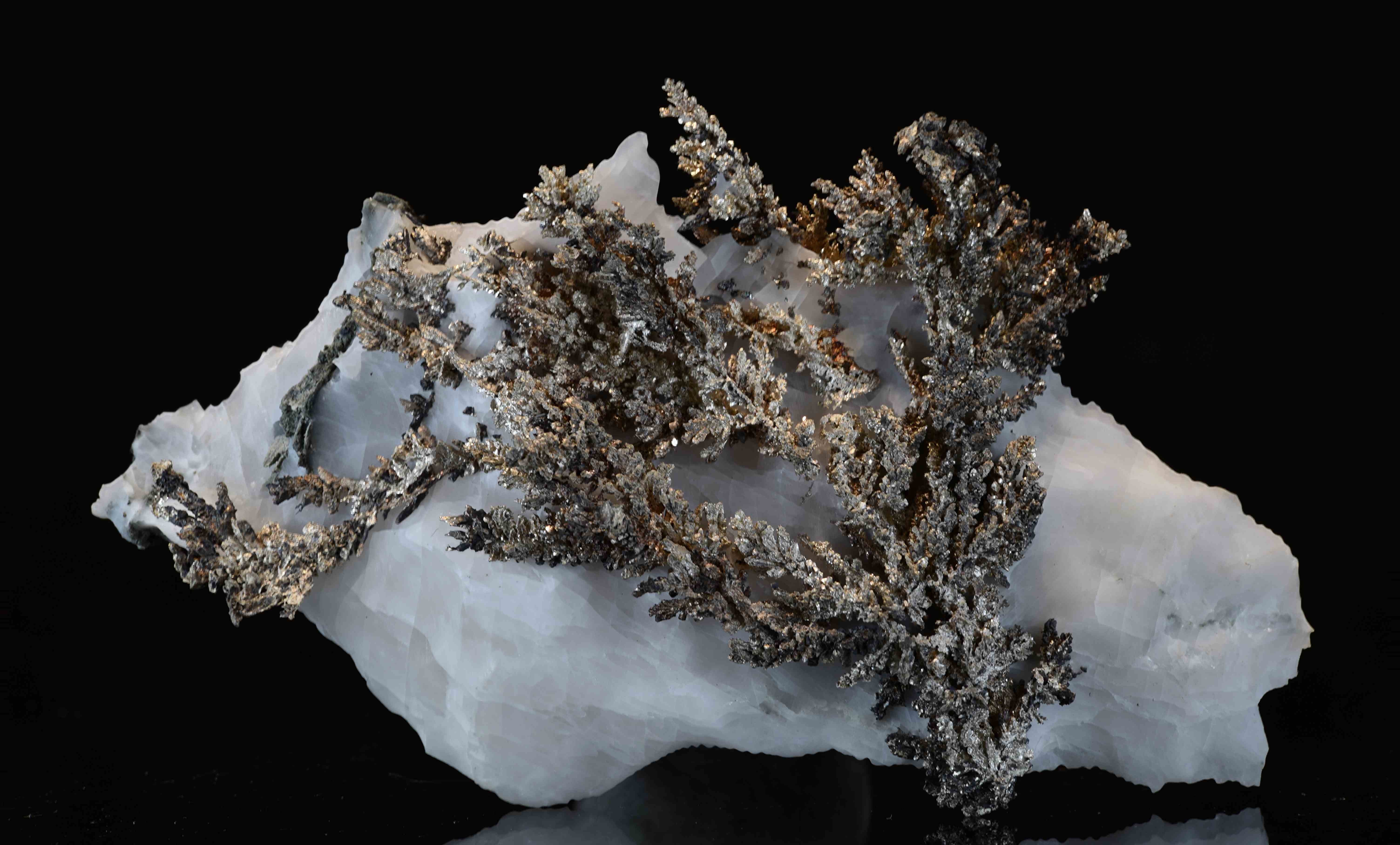 Très beau spécimen. Il me semble que c'est une dyscrase (dyscrasite -  Ag3Sb) pour être précis. Elles sont effectivement à la mode dans les bourses depuis quelques temps. La mienne a aussi noirci. Est ce que l'antimoine y est pour quelque chose ?