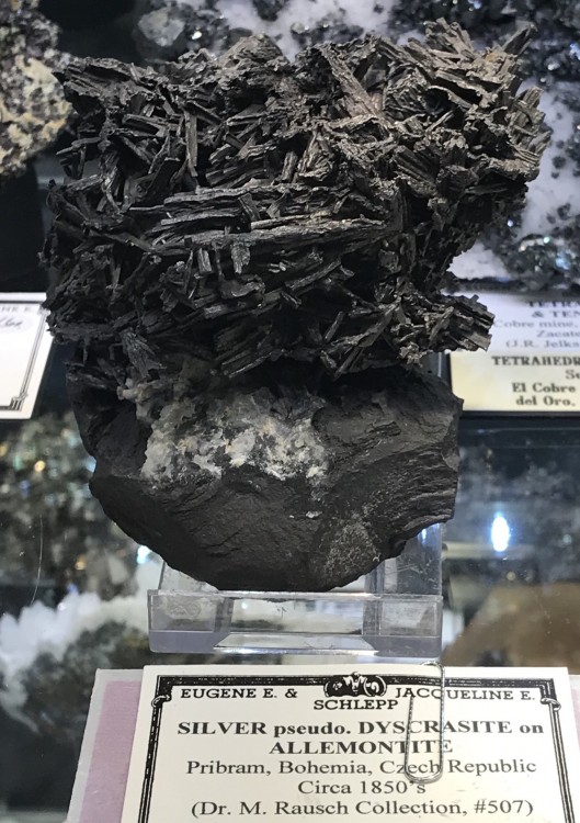 Cristaux d’argent natif après dyscrasite sur arsenic natif, mine de Pribram, Bohème, République Tchèque.