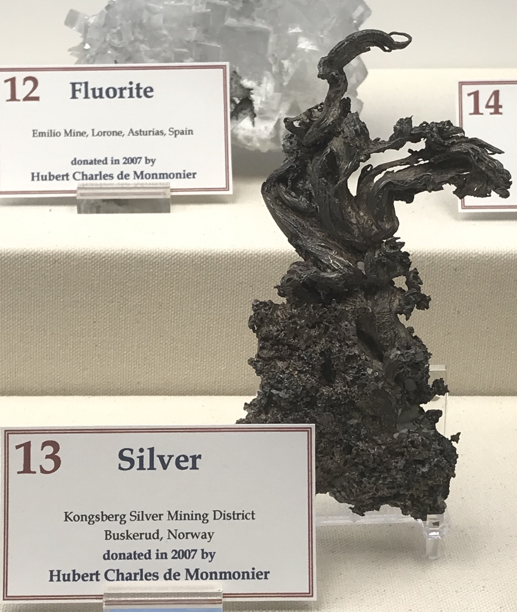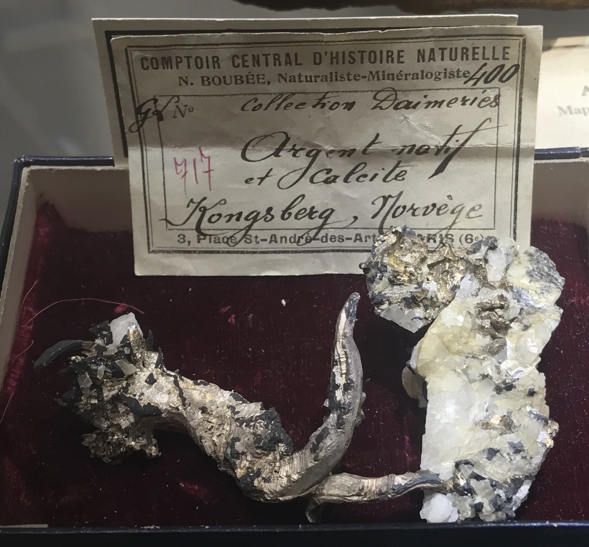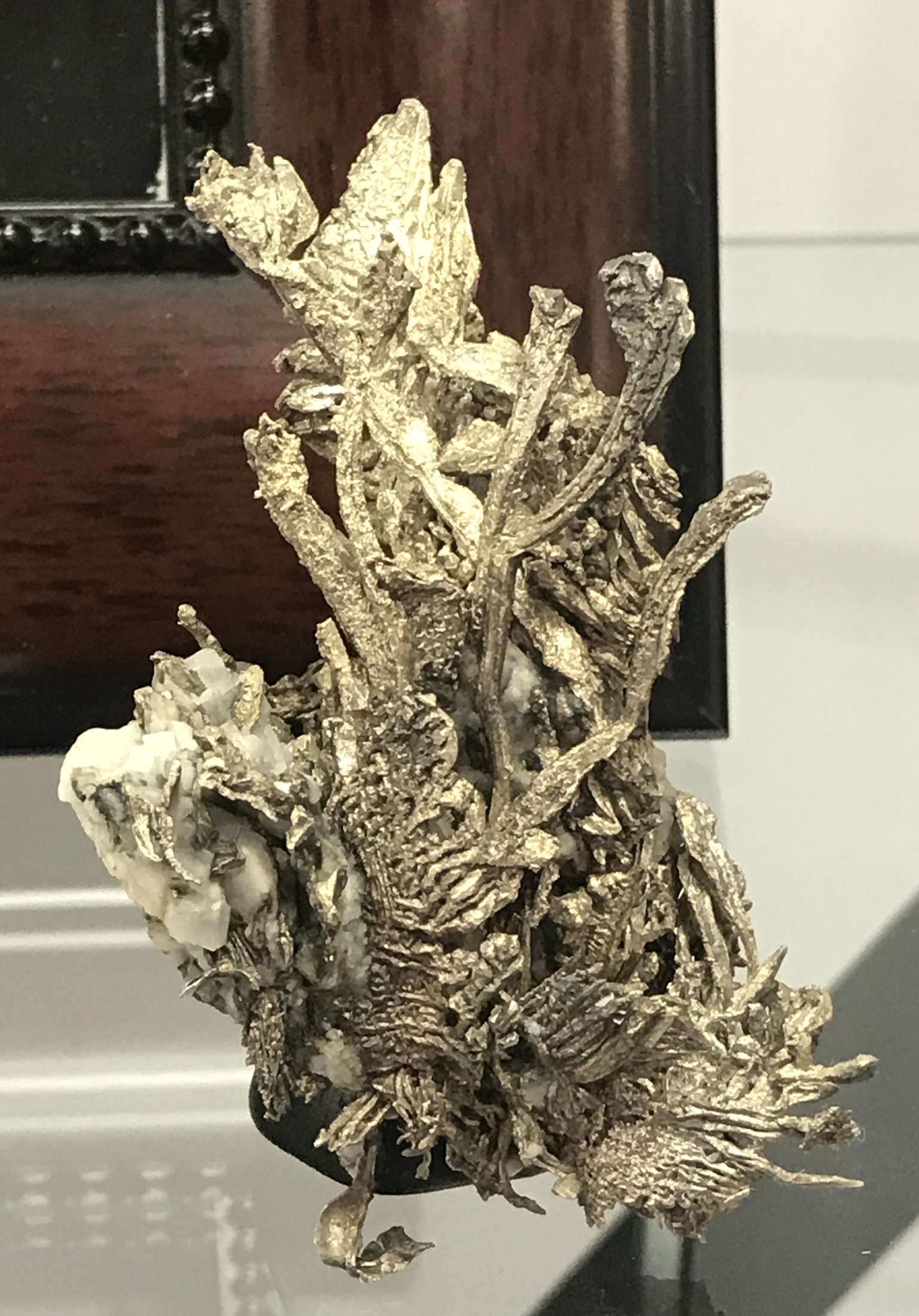 Une petite œuvre d'art composée de fougères métalliques sur une gangue entièrement constituée d'Arsenic natif. Les fougères sont en réalité de l'Argent natif. Cette association vient de la mine d'uranium de Pöhla-Tellerhäuser, Monts Métallifères (Pays de Blanche-neige et des 7 nains), Schwarzenberg, Saxe, Allemagne. Outre l'uranium, ce gisement est un grand classique mondial pour sa minéralogie polymétallique (Argent, Arsenic, Uranium, Cuivre, Cobalt, Etain, Antimoine, Plomb, Fer, Wolfram...). Collection personnelle, 7 x 6 x 2,5 cm.
