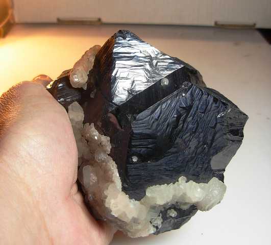 Avec le rose de la paume de mon ami Giovanni ou Sandro qui donne l'échelle, ce sphénoèdre de blende marmatite avec la macle de l'étain me fait penser à un beau vieillard jovial avec sa barbe blanche, qui va enfiler son costume rouge de Noel pour prendre son poste aux Nouvelles Galeries (bon, je sais, c'est l'heure de l'apéro! je sors :sourire: . Je vais prendre mon poste à la fête de la Science)