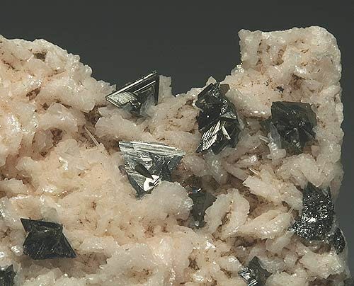 specimen de 7 x 5 x 2 cm de dolomite, avec tétraèdres remarquablement striés, parfois maclés, de 5 mm d'arête